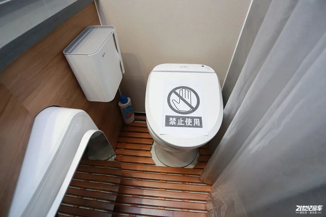 这款车卫生间配备的是电动粉碎式马桶,尺寸非常接近家用马桶。马桶旁边还配有纸巾盒,整体来说基本和家用卫生间差异不大。