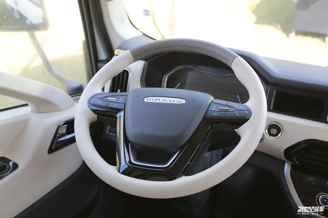 虽然是轻卡底盘,但上汽大通对H300的驾驶舱内饰进行了重新设计,以白色和黑色为主导;三幅式多功能方向盘进行了真皮包覆,手感细腻,整体看起来并没有卡车的感觉。车内配有驾驶员疲劳监测系统、多功能方向盘、流媒体后视镜、全液晶的仪表盘,看起来极具科技感。