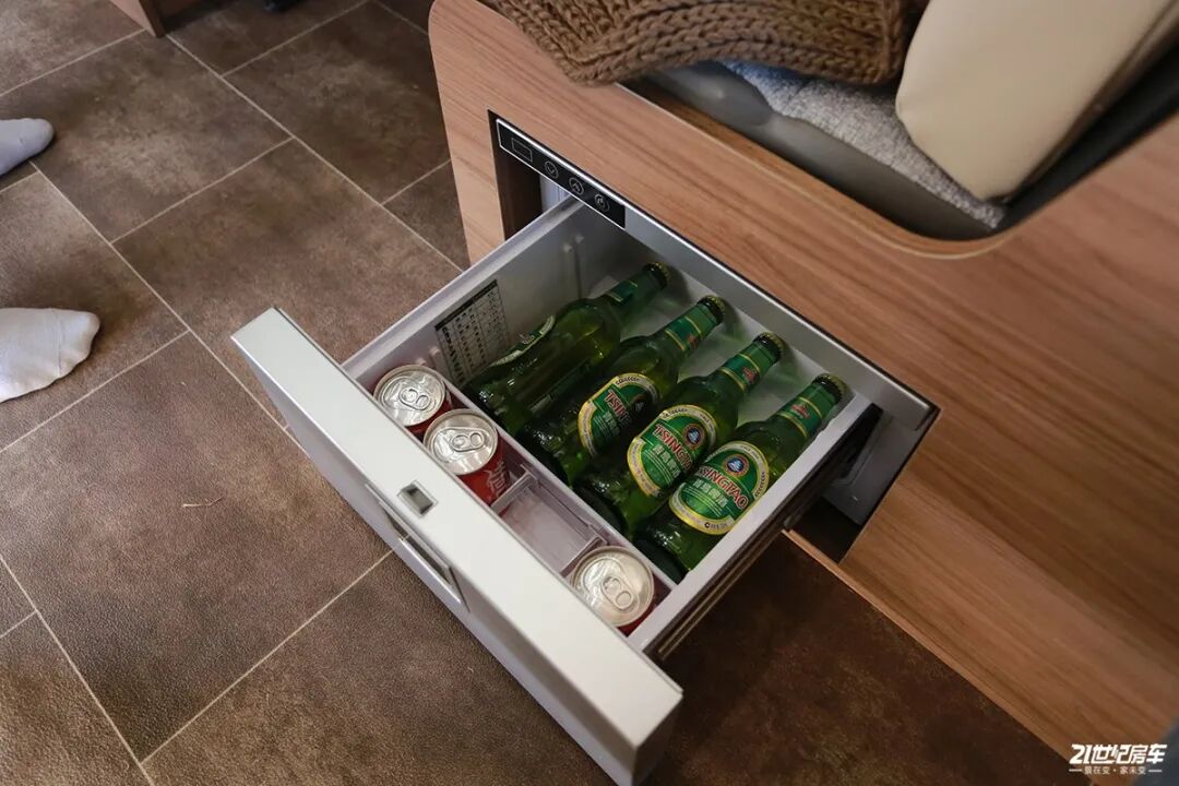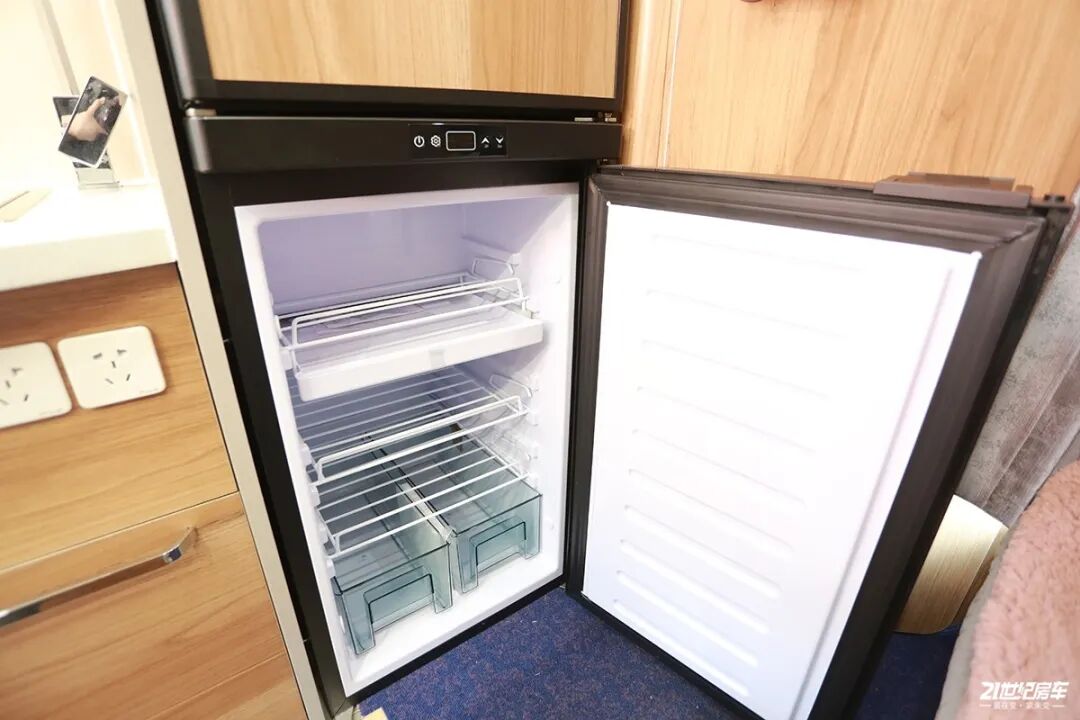 冰箱采用今年比较流行的双冰箱上下叠加设计,两台冰箱容积完全一致,均为76L,冰箱温度调节范围是负18℃-5℃,用户可以根据自己的喜好,设置冷冻区位置,甚至可以将两台冰箱都作为冷冻或冷藏冰箱使用。另外,算上会客区沙发下方的饮料冰箱,这款车一共拥有三台冰箱,可以充分满足用户的使用需求。