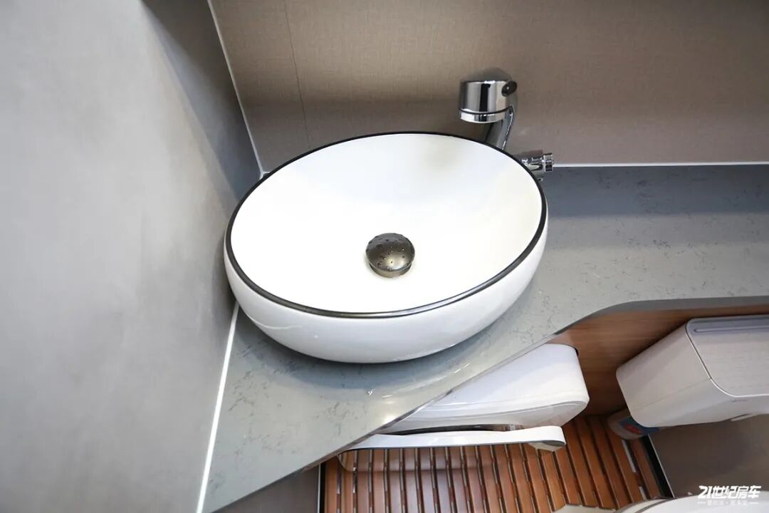 洗脸池整体尺寸在房车中算是比较大的了,甚至和家用洗脸池比较接近。洗脸池整体采用椭圆形设计,看着非常有生活气息。