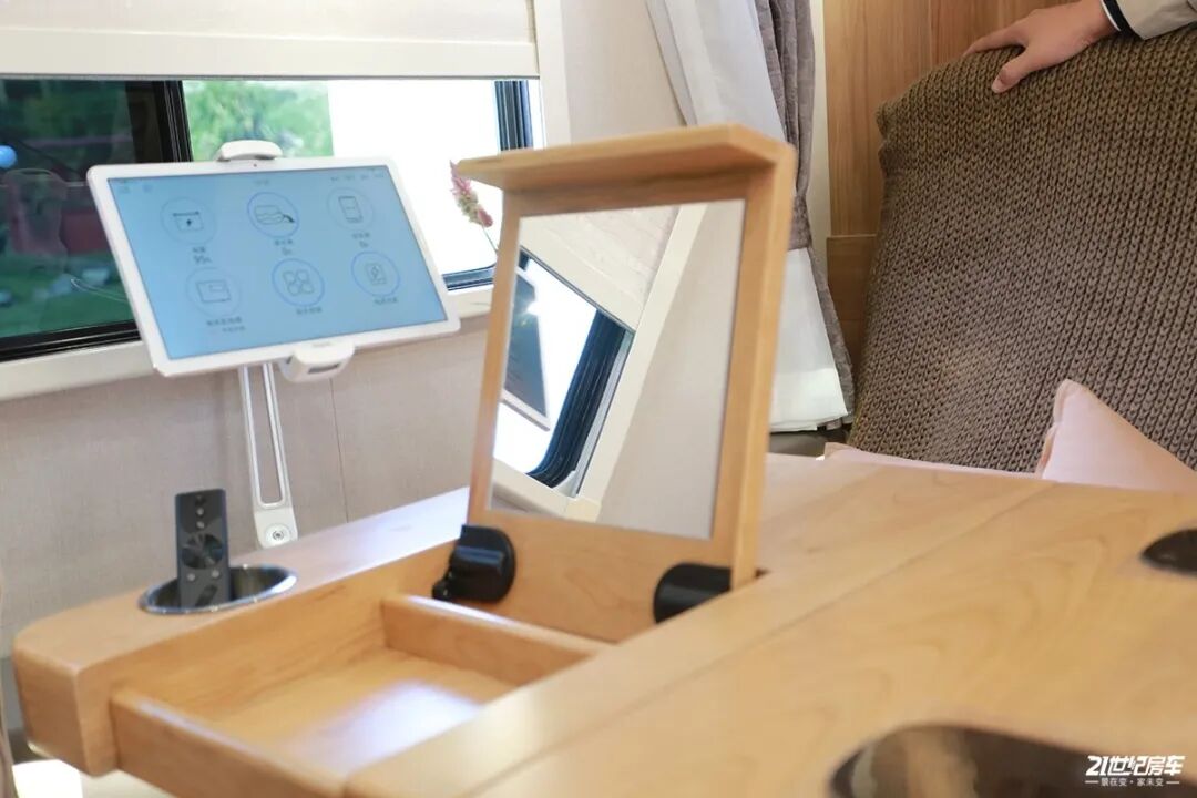 会客区采用对卡座式+升降桌布局,升降桌上配有梳妆镜、化妆盒、水杯架、手机无线充电座。会客桌旁边靠近车窗位置,还有一个可以用来控制车内电源的Pad,用起来非常方便。