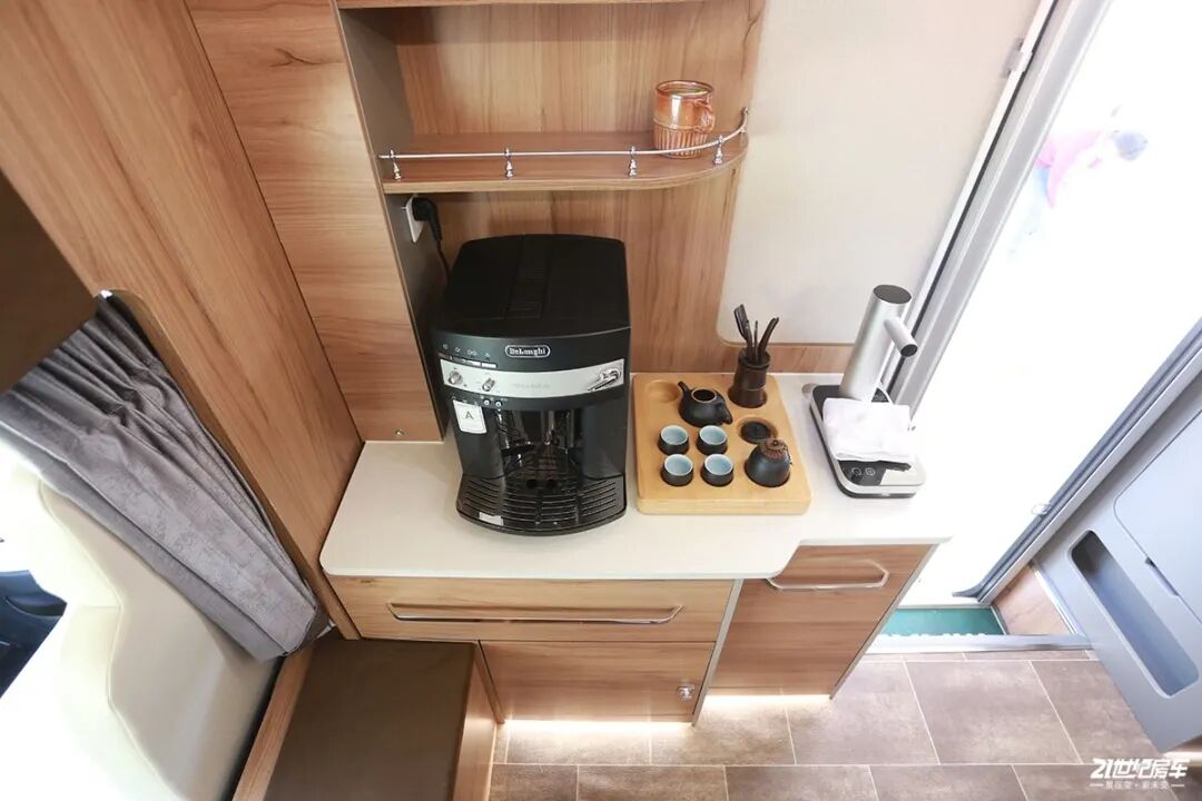 厨房被乘客门分为前后两部分,前半部分配有咖啡机、茶台、饮用水出水口,比较适合用来做一些下午茶;另外,台面下方还有非常充裕的储物空间。后半部分配有翻盖洗菜池、高脚水龙头、房车专用冰箱等;台面下方同样配有非常充裕的储物空间。