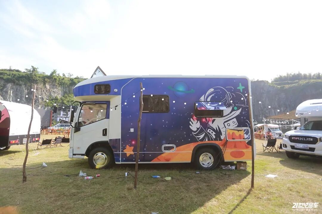 配色方面,生活家H60房车并没有采用房车常用的白色车身配拉花设计,整车以深蓝色为主色调,并搭配行星、宇航员等图案,而且图案看着非常卡通,极具年轻感。