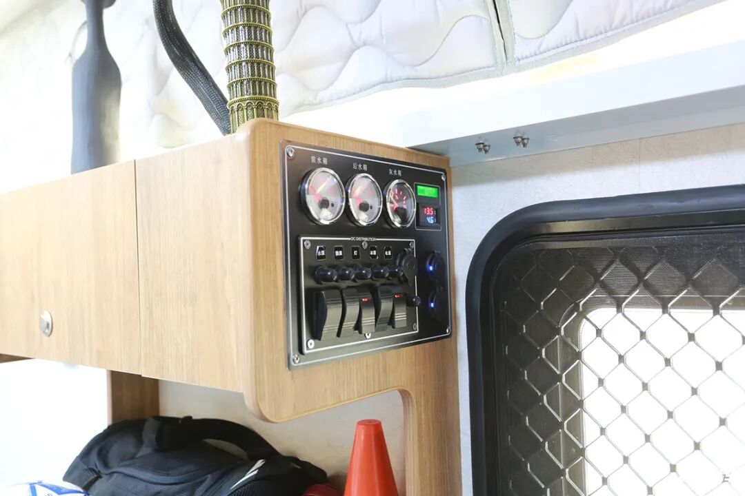 橱柜顶部还要一个储物吊柜,在吊柜一侧嵌有这款车的控制面板,可控制水电设备的开关及容量显示,目前官方还未公布相关参数。