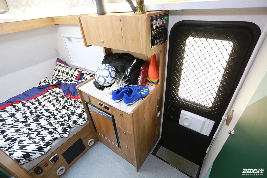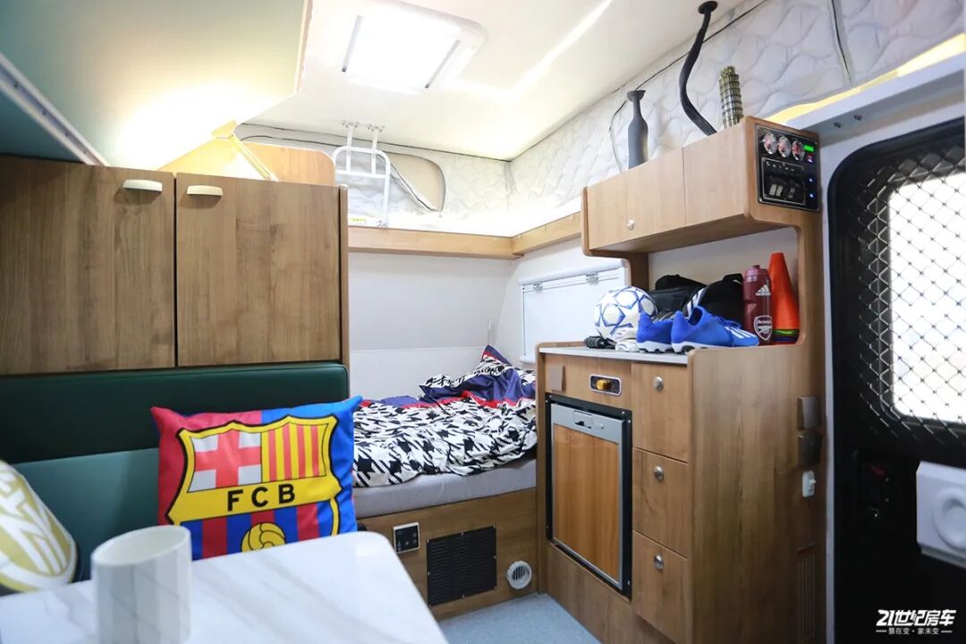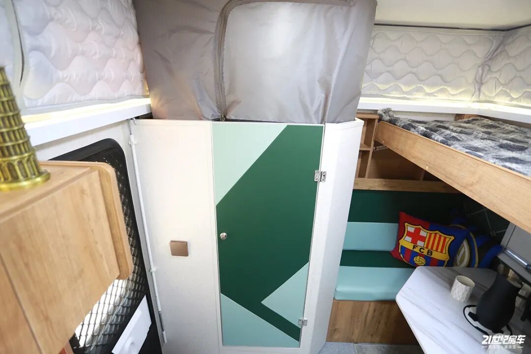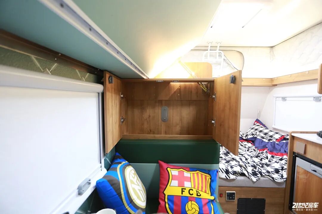 进入车内,通过车顶的升顶式设计,使得内部十分宽敞;家具方面,都采用了环保的轻质板材,安全无味;原色木纹家具搭配绿色的布艺及板材涂装,既与车外拉花相呼应,又有走入大自然的感觉。另外,升顶结构的保温效果和支架的稳定能力都很强,即使到了寒冬的冬季,在野外露营也不会感觉到很冷。