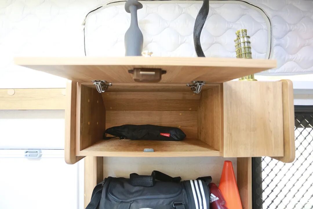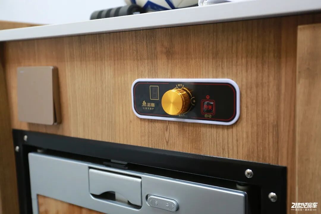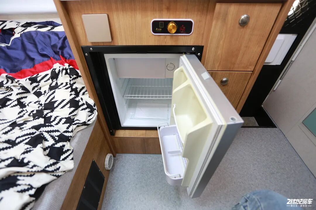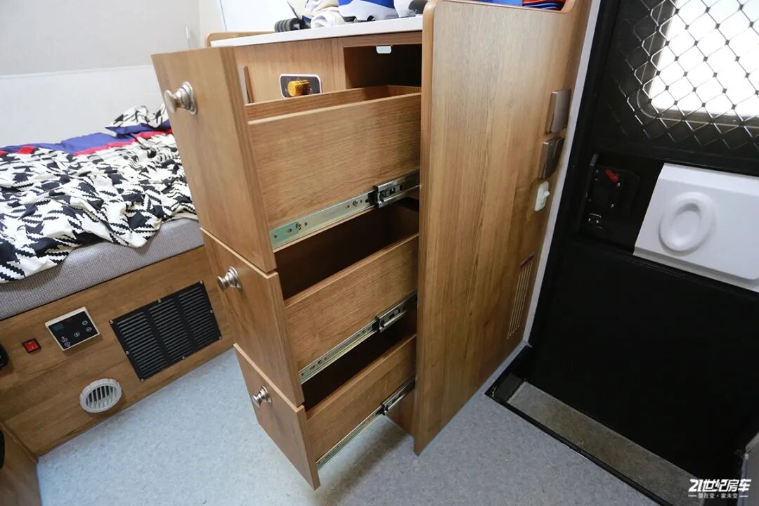 下方为一台房车专用冰箱,容量不是很大,可放置一些食物及饮料。冰箱旁边是三个抽屉,纵向空间不错,可直立放置一些调味料等厨房用品。