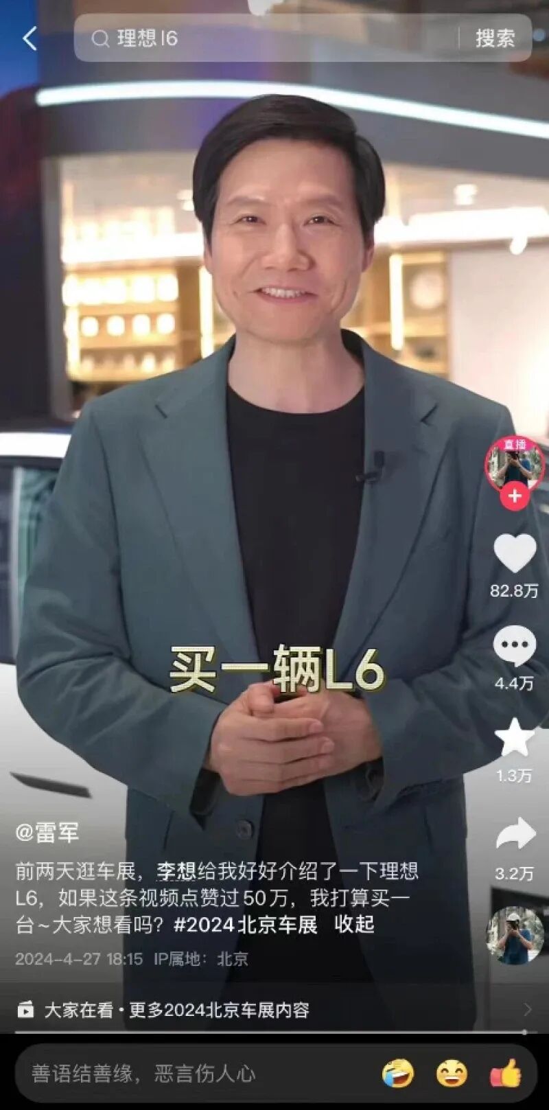 后续就有人问雷军“留下印象最深的是哪一台车”。雷军表示,理想L6在北京车展上给他留下了深刻的印象,如果他这条视频点赞量超过50万,他就购买一辆理想L6。