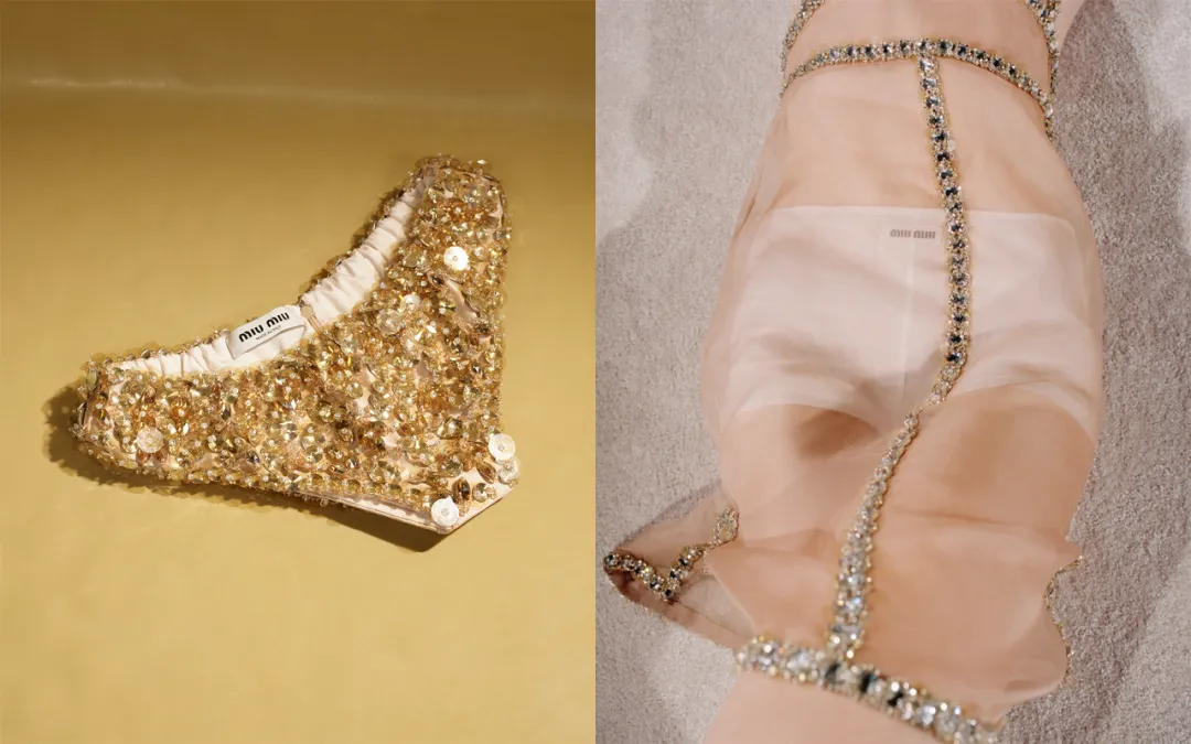 内裤外穿,确实是本末倒置,但是不同于平时穿的内裤是消耗品,MIU MIU的镶钻内裤,是奢侈品。