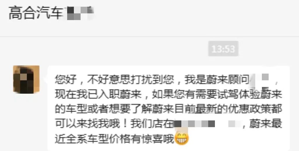就在刚刚,我收到前高合汽车销售发来的信息。入职蔚来的他,表示近期全线车型均有惊喜优惠。