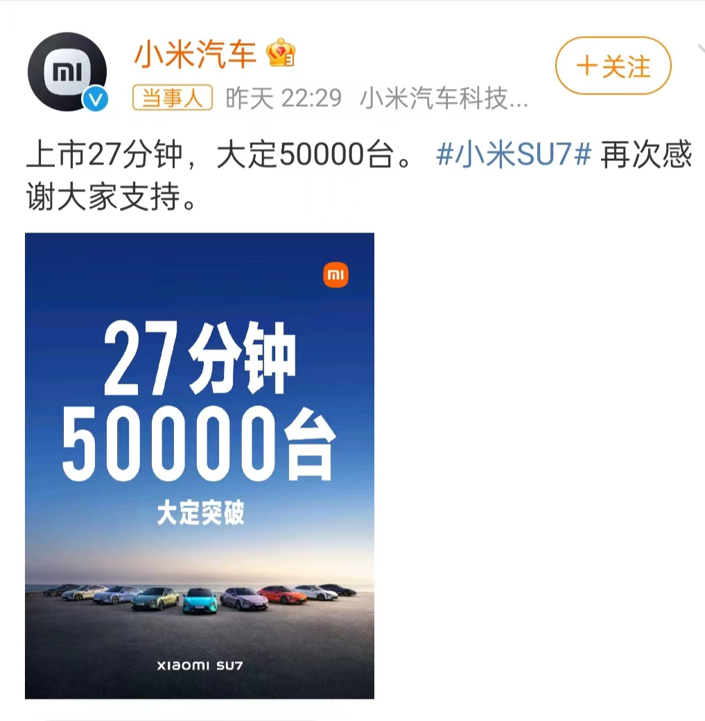 昨晚10点29分,小米汽车官方微博发布海报“上市27分钟,大定50000台,再次感谢大家支持。”