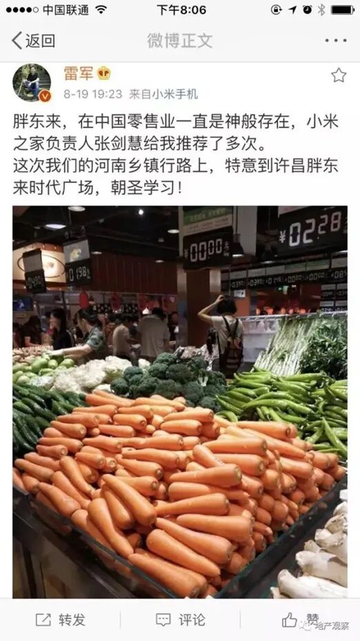 关注小米老大雷军总微博的应该都记得,2017年他一直在河南的几个城市和乡村巡查小米之家,并发微博说:特意到许昌胖东来的时代广场,朝圣学习!