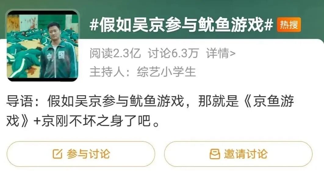 在里面穿着中国梅花牌外套的吴京就是神一般的存在,是游戏的bug,子弹机关枪横扫也分毫无损,相关话题“假如吴京参加鱿鱼游戏”也一度登上热搜。