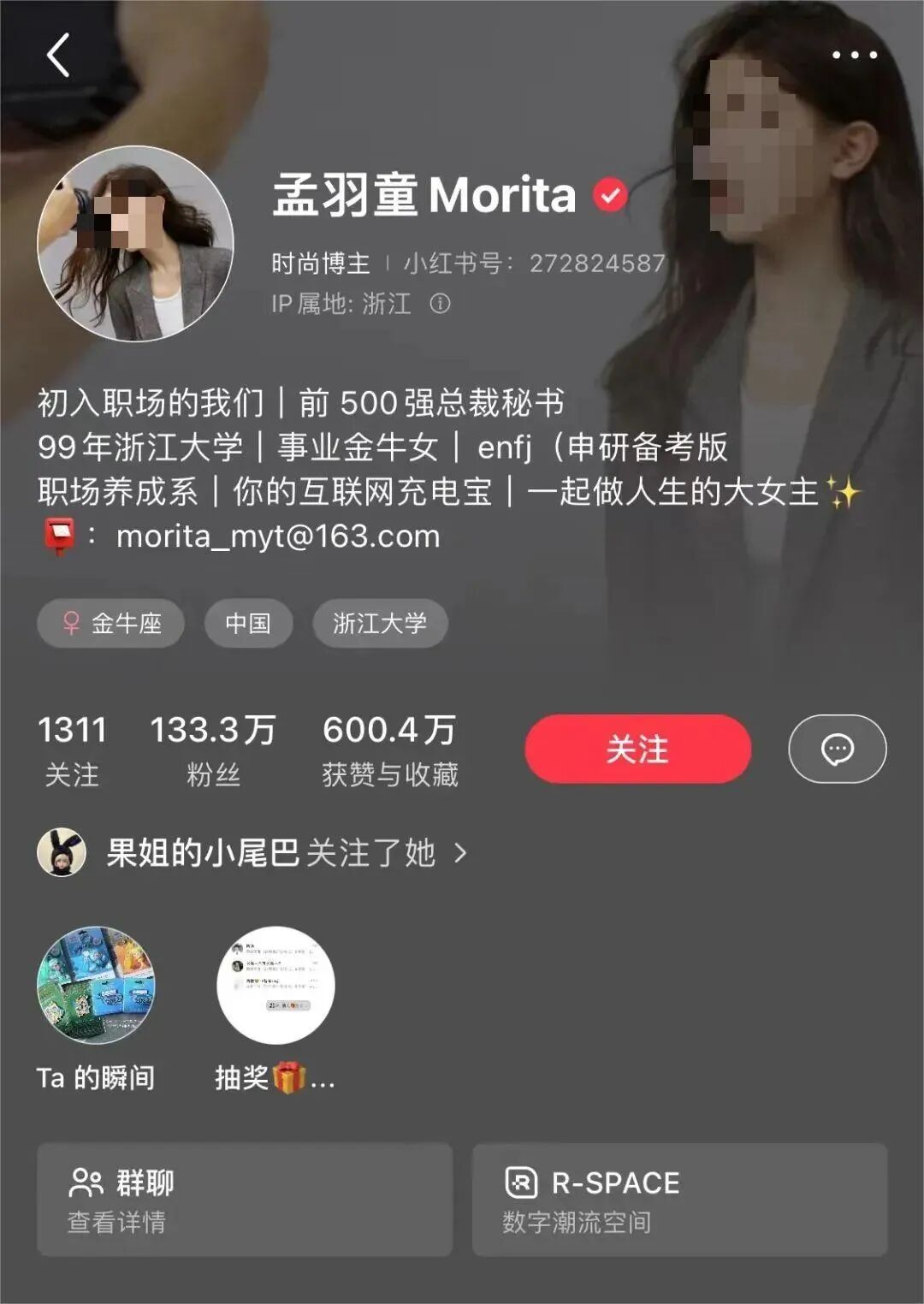如今,在小红书上,孟羽童已有超过133万粉丝。个人签名处的“前500强总裁秘书”赫然在目。