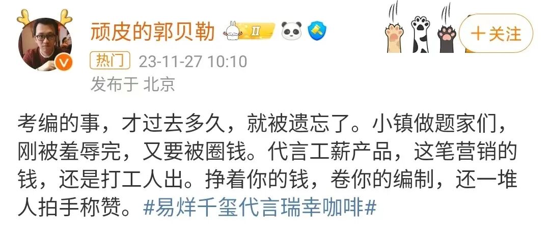 易烊千玺过往所谓“小镇做题家”的争议也最终成为了不少人抛弃瑞幸的理由。