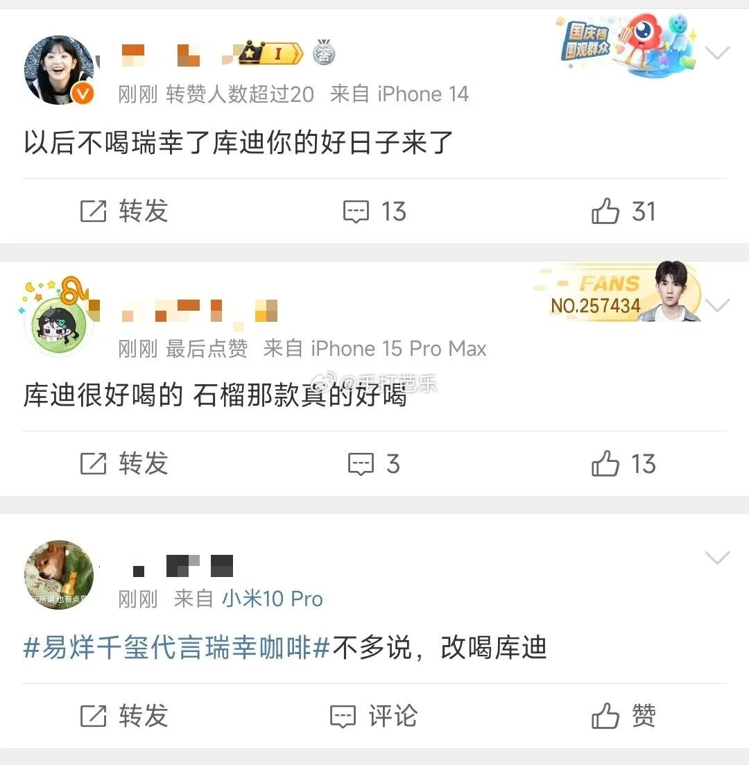 但让我更意外的是,前脚还在玩梗蜜雪冰城,调侃“坐在易烊千玺腿上喝瑞幸”的网友后脚就投向了库迪的怀抱。