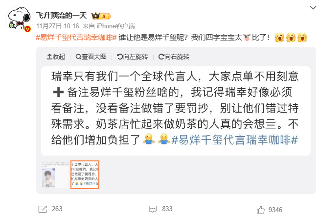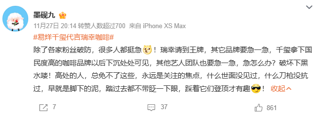 从其他流量明星的破防到其他奶茶品牌的破防,这位不知是粉丝还是路人的网友早已竭尽揶揄之事,对别家idol和品牌发起了进攻。