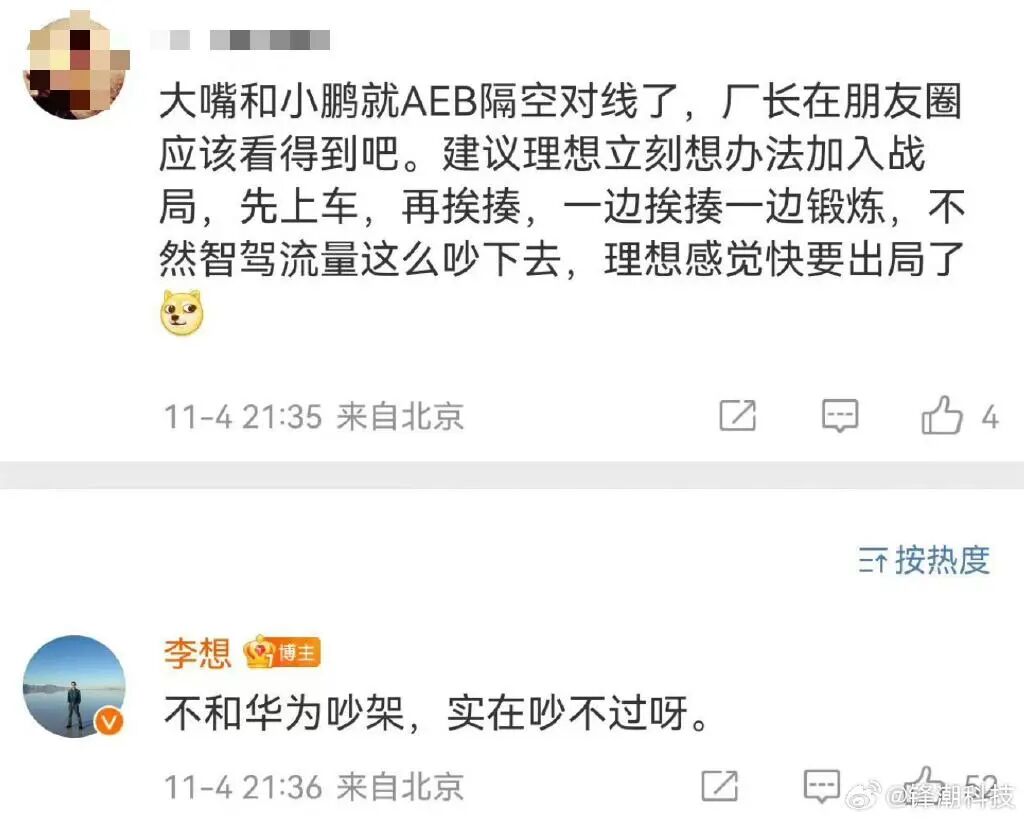 之后,这场争端逐渐演变为汽车圈的大论战,多家大佬纷纷就 AEB发表了自己的见解,不过大多数都是还抱着吃瓜心态,李想也就此表态:“不和华为吵架,实在吵不过呀。”