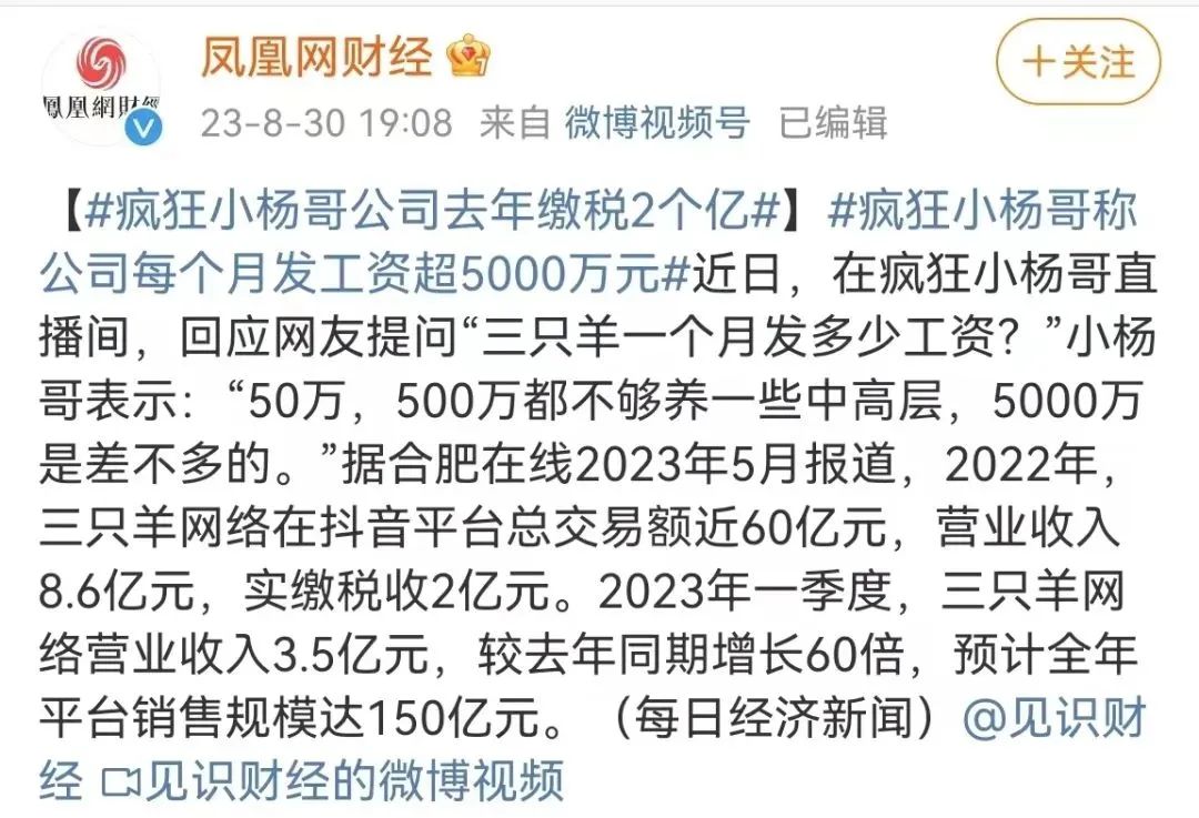 一次,是在直播间有网友提问“三只羊一个月发多少工资?”时,小杨哥表示:“50万,500万都不够养一些中高层,5000万是差不多的。”