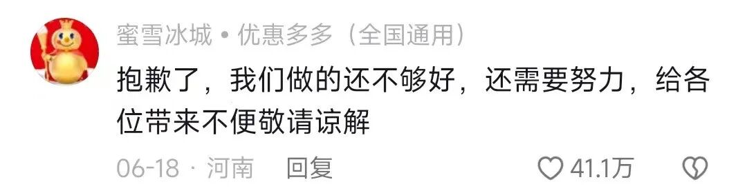 蜜雪冰城就是好例子。低价又接地气是蜜雪冰城的形象,即使被点名安全问题,网友都自觉找出理由:“蜜雪不嫌我穷,我有什么资格嫌弃他脏。”