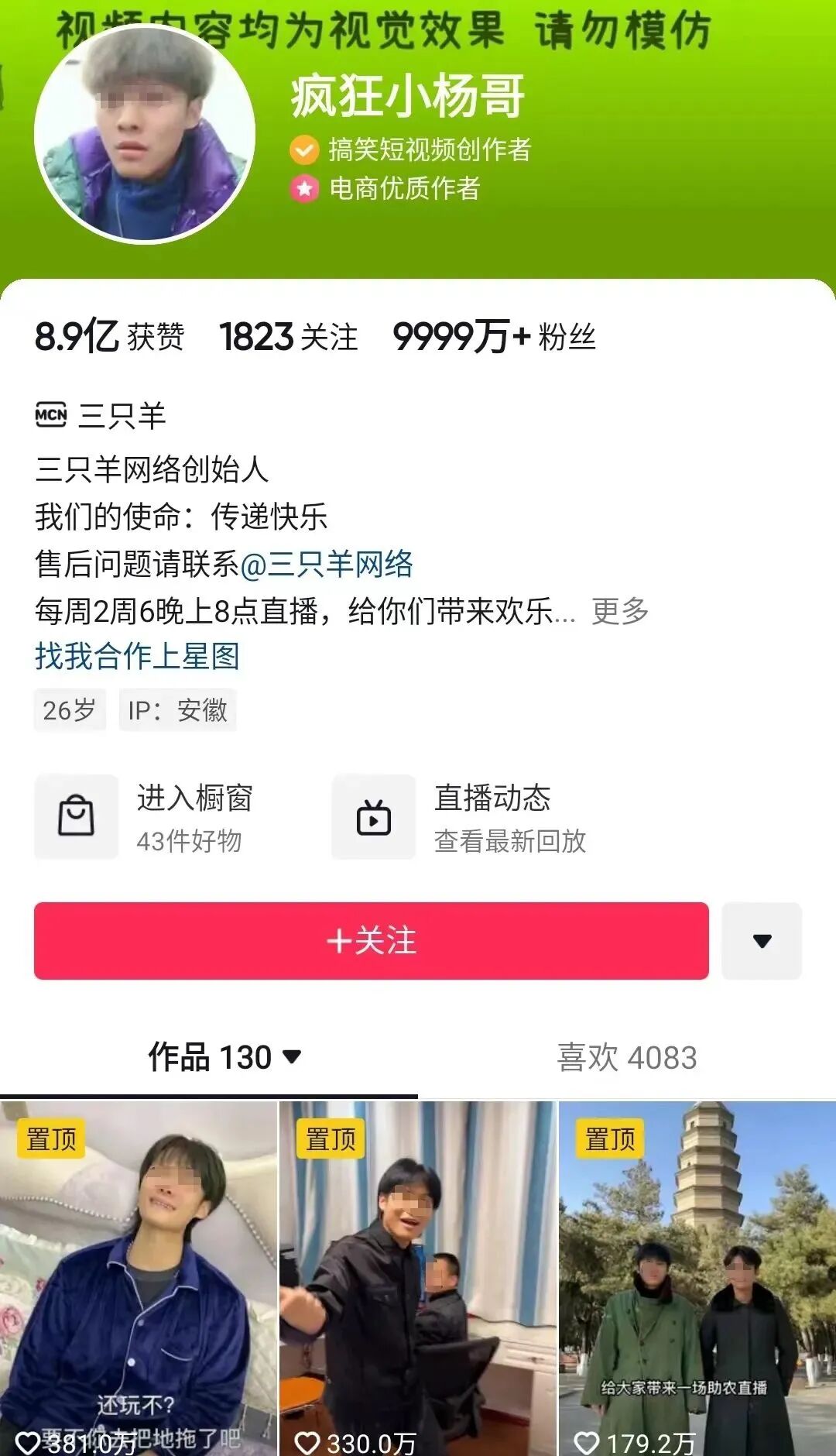 有人说,疯狂小杨哥就是“抖音之子”,他是抖音发展壮大、丰富生态的过程中,一轮一轮算法自然筛选出来的“天选之子”。