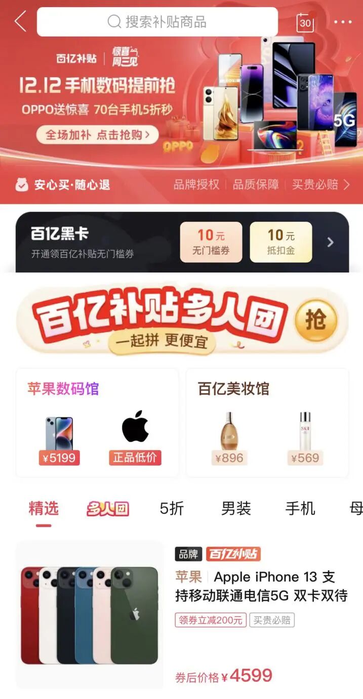 当然除了砍一刀,拼多多还有一个吸引用户的拿手好戏便是百亿补贴。