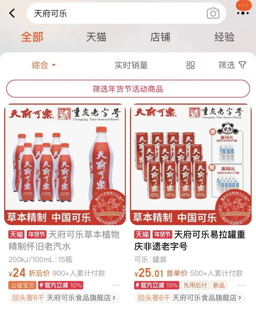 例如在天府可乐天猫旗舰店上,折扣后只需要24元就可以买到15瓶的量贩装,月销量只有千余单左右。对比百事可乐、可口可乐等动辄数以万计的成交量而言,几乎可以忽略不计。