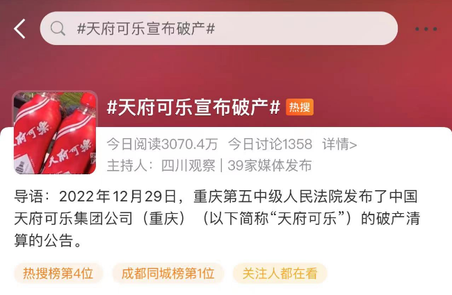 就在最近,重庆市第五中级人民法院发布了一则关于天府可乐破产清算的公告,消息一出,很快就冲上了微博热搜。不少网友表示以后再也喝不到了,对于天府可乐的退场感到惋惜。