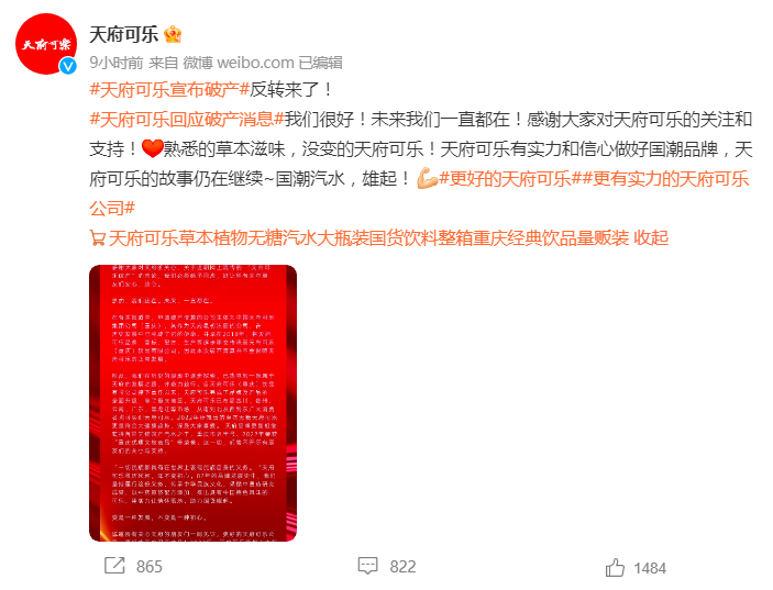 不过很快天府可乐官方就对此进行辟谣,并表示申请破产是早期的经营企业,目前天府可乐仍然在稳定生产及运营,天猫旗舰店也在正常销售中。