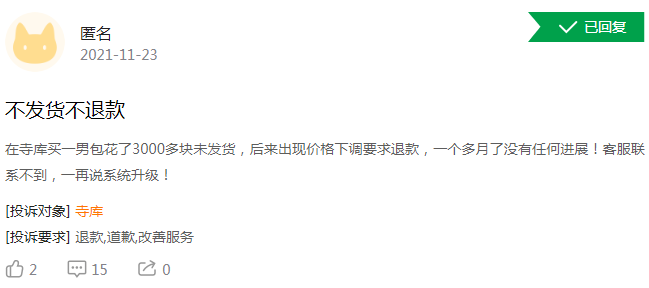 自2021年10月以来,有关寺库商品发货慢、产品质量差等投诉在不断增加。