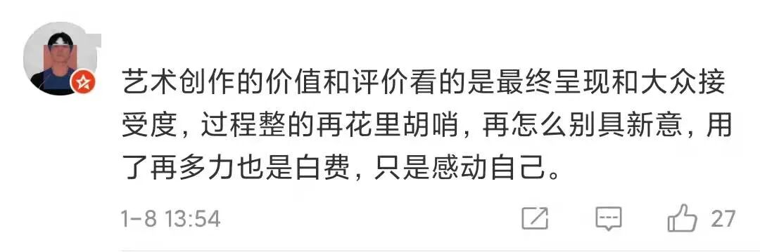 甚至网友批评:过程花里胡哨,最终呈现却不能让大众满意的艺术创作是毫无价值的。