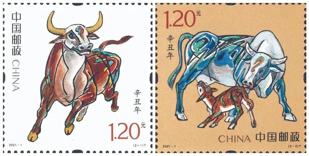 看一下《辛丑年》特种邮票里面的公牛精力充沛,奋发图强,寓意着这一年牛气冲天。而母牛母子,也是一副舐犊情深的样子。