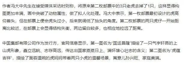 由于争议太大,这两枚邮票的设计者冯大中老师出来解释:是将老虎拟人化,让老虎跟人一样也拥有喜怒哀乐。