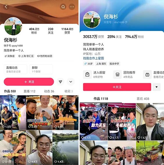 但更为重要的一点是,倪海杉通过这种方式不但屡屡出圈,还在抖音、快手一共积累了1200万粉丝。