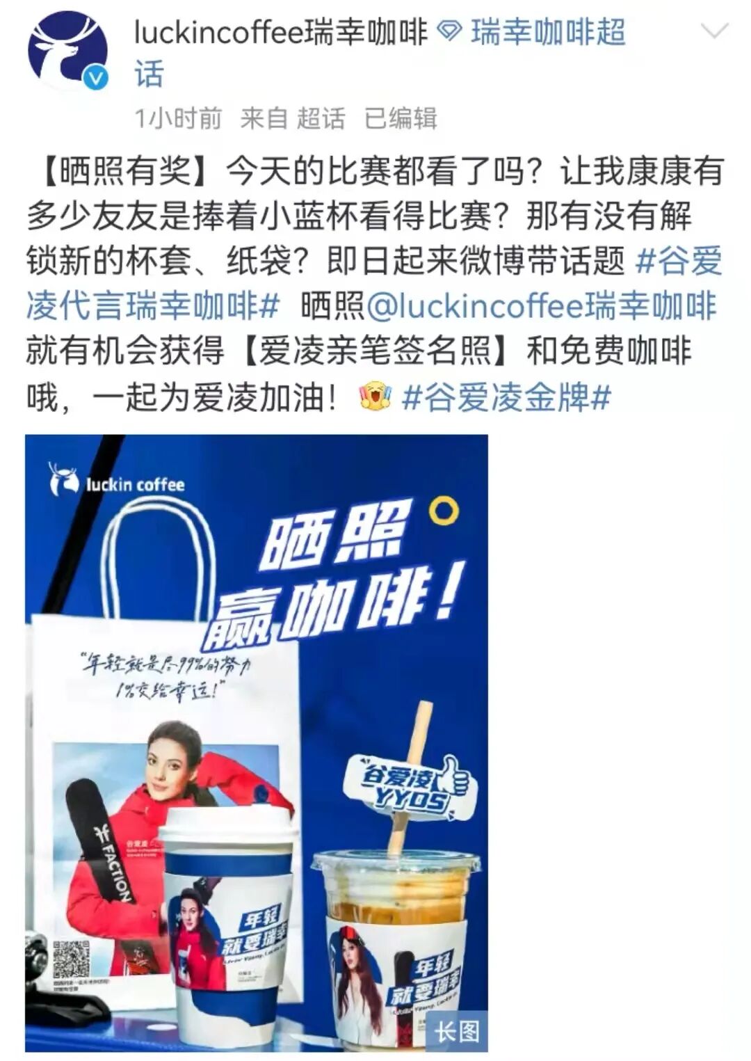 在谷爱凌的近30个代言中,瑞幸咖啡算得上是用心追随的品牌之一。