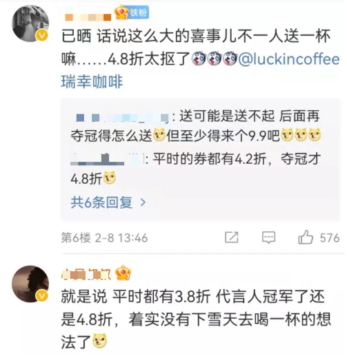 再者,平时都有3.8折的券,代言人夺冠了才4.8折?