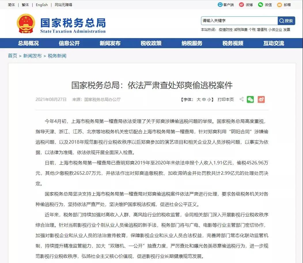 8月27日,国家税务总局通报,依法严肃查处郑爽偷逃税案件,追缴并处罚款共2.99亿!而此前,郑爽因为涉嫌签“阴阳合同”被调查,更贡献了一个新的计量单位:一爽=208万。