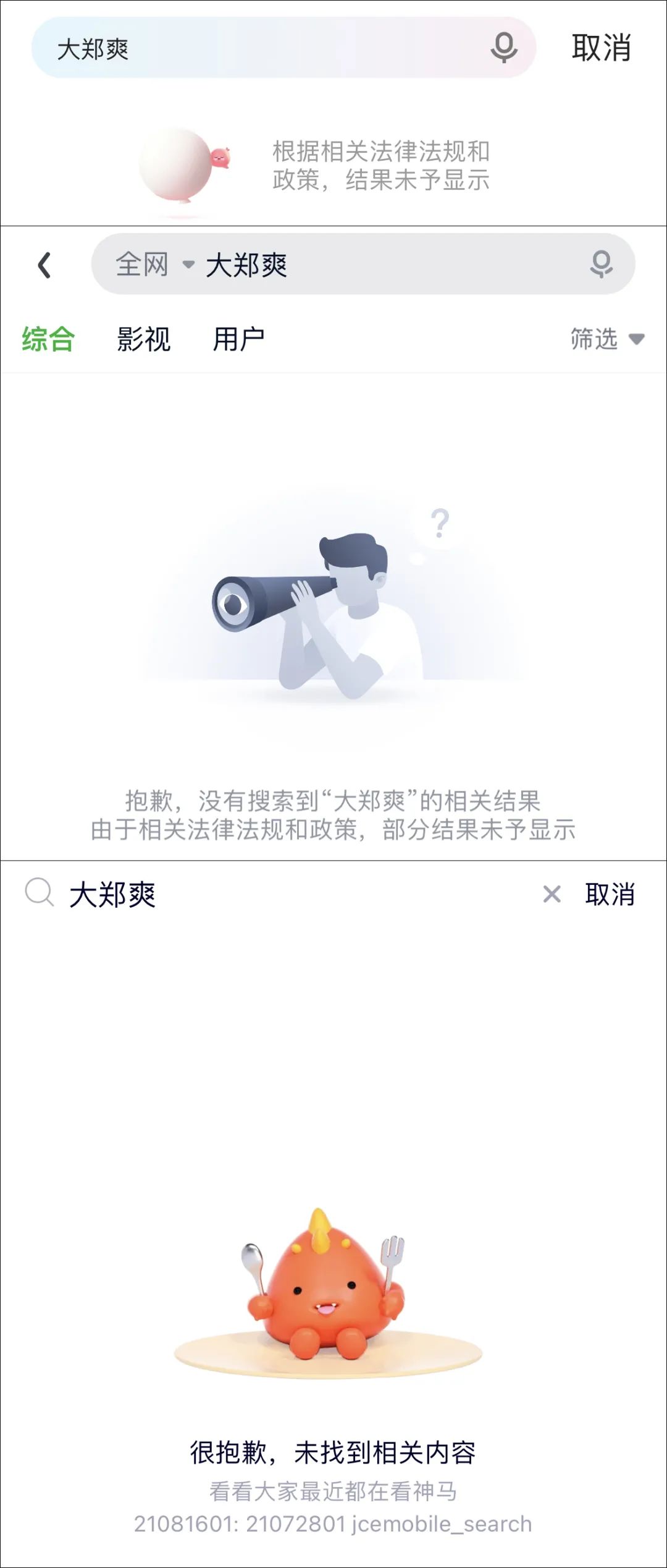 但是,在视频平台搜“大郑爽”“郑爽angel”等,仍然是“根据相关法律法规和政策,结果未予显示”,只能搜索电视剧名字才能观看。