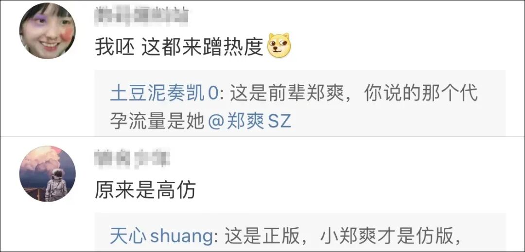 在郑爽一开始因为“代孕弃养”“天价片酬”“阴阳合同”“偷税漏税”等被舆论围攻时,大郑爽总会被“走错片场”的网友误伤,甚至被骂成“蹭热度的高仿号”。