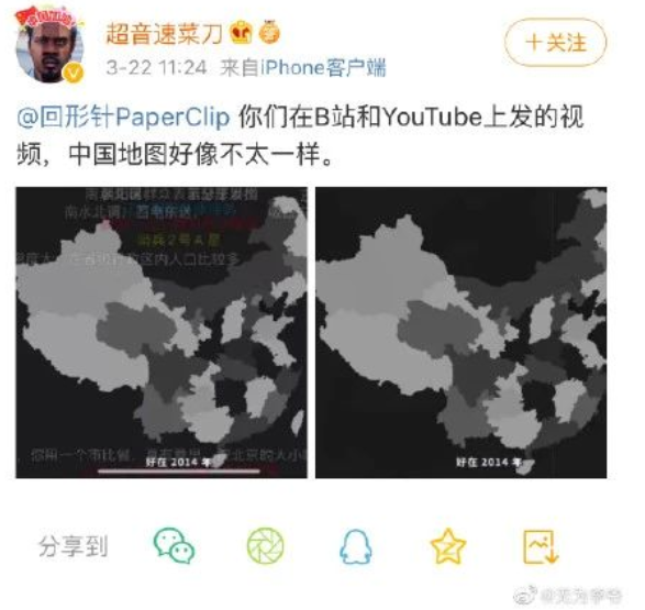 去年年初,科普视频自媒体回形针因为“在Youtube和B站的同一视频里出现两个版本,其中YouTube平台上地图缺少台湾”这样的“地图双标”,在网络上引发了争议。