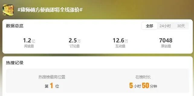 收到这些消息影响,5月16日,“康师傅方便面要涨价了”的消息冲上热搜,话题讨论量很快便成功破万,话题浏览量更是高达1.2亿。