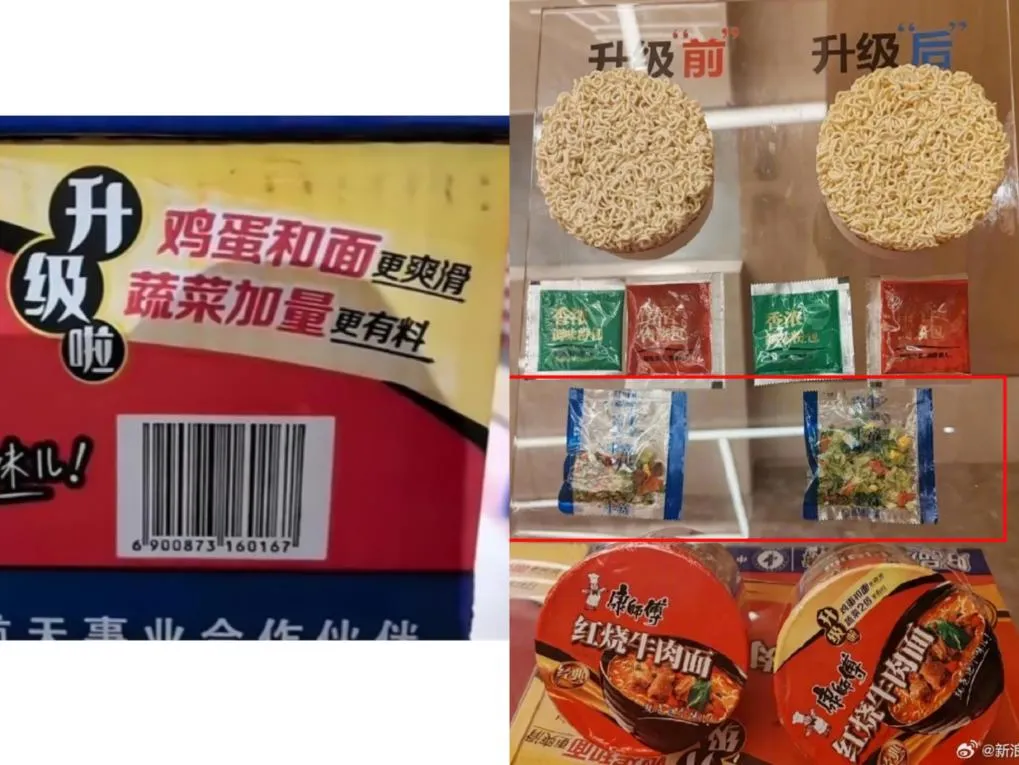 更有消息称,康师傅最新配送的一批货,已经印上了新的升级标语。从流传的图片来看,新配送的康师傅产品上面印有“鸡蛋和面更爽滑,蔬菜加量更有料”等醒目的标语。升级后的面饼似乎变得更大,蔬菜料包更多,包装规格更大。