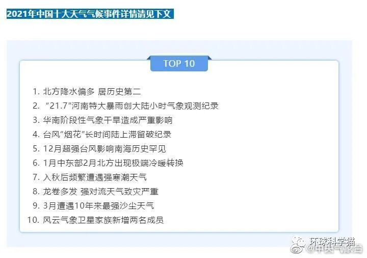 2021年“中国十大天气气候事件”出炉,气候中心发布了一份详细地表,从这个10个天气事件来看,无非对大家印象最深的可能就是“河南特大暴雨”的问题,其次就是入秋后频繁出现强寒潮气候,同时还有3月遭遇10年来最强沙尘天气等等。而对于我个人来说,2021年的降雨的问题,还是想多说几句。