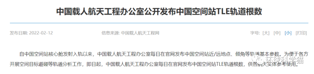 据中国载人航天工程办公室发布消息指出,为便于各方开展空间目标避碰等轨道分析工作,即日起,中国载人航天工程办公室每日在其官网发布中国空间站TLE轨道根数,供各航天实体参考使用。