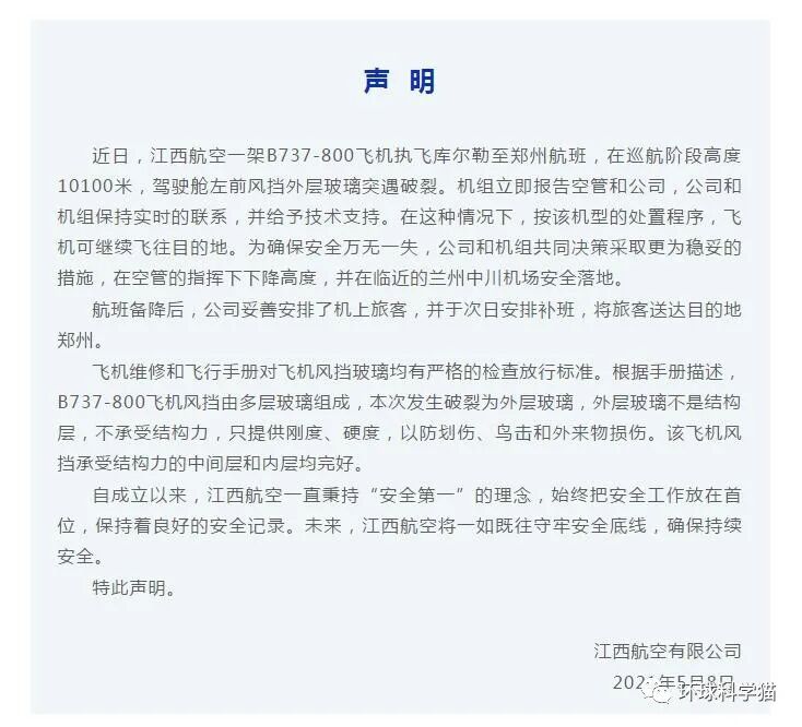 2021年5月,一架波音737-800型飞机在万米高空巡航时,突然遭遇风挡火花燃烧爆裂。涉事航班为江西航空RY8984航班,该航班执飞库尔勒至郑州,因突发状况于当日23时许备降兰州,机组及旅客均安全离机,旅客于次日中午补班抵达郑州。