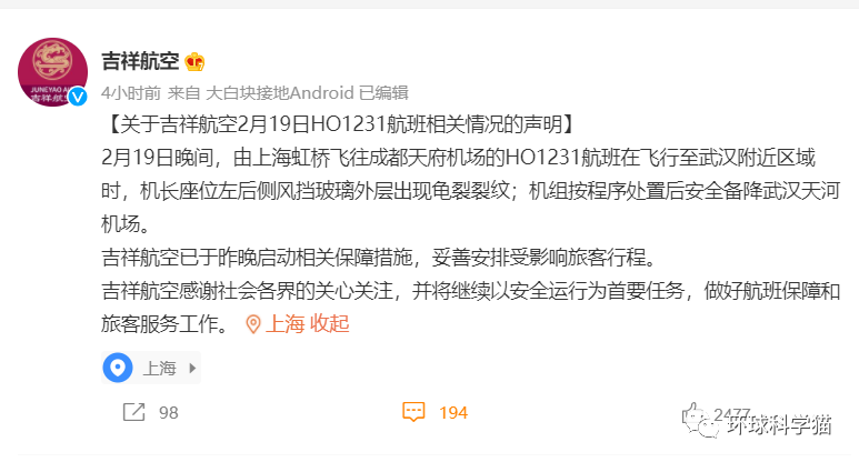 在2月20日的时候,吉祥航天发布了说明,是机长座位左后侧风挡玻璃外层出现龟裂裂纹,机组按程序处置后安全备降武汉天河机场。所以,又是一起关于飞机玻璃的事件。但是具体是什么原因导致的,暂时还没有官方给予说明。