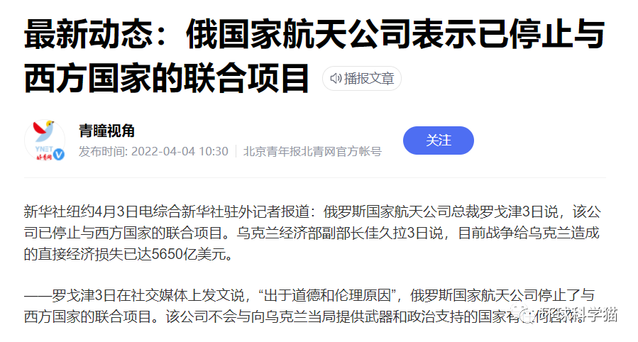 而且俄国家航天公司表示,已停止与西方国家的联合项目。这只是说“联合项目”停止,但是并没有说明是不是彻底“断开”,所以,国际空间站是不是真的“分家”了,还是暂时性的“联合项目”停止,我们也只能继续等待下一步的说法,并且国际空间站暂时也还没有执行俄罗斯舱位分开国际空间站等问题,这就是大概情况。