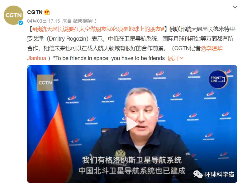 而这会,CGTN记者在进行对俄联邦航天局局长德米特里·罗戈津(Dmitry Rogozin)采访的时候,公开表示: