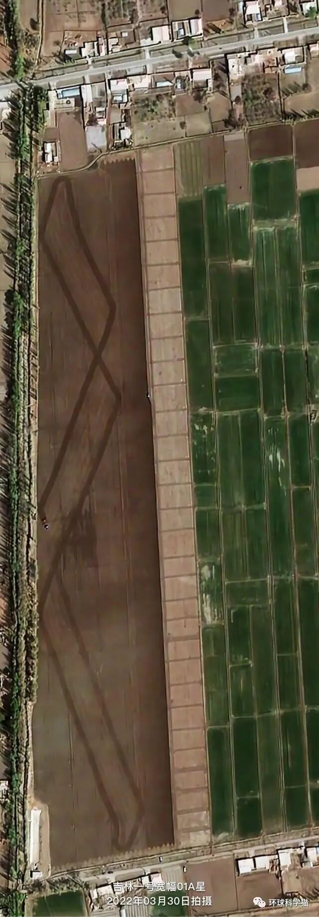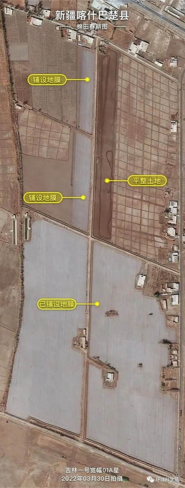 所以,这是一个全球性拍摄的卫星系统。下面就来看图,这是吉利一号发布的一波新卫星图像,是针对新疆地面农业活动进行的一个拍摄。