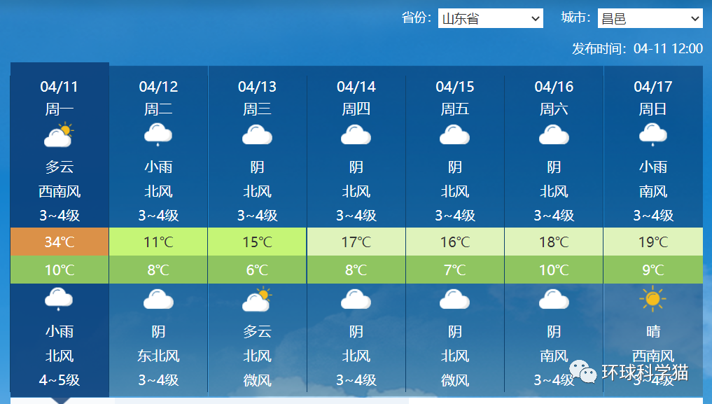 例如:山东昌邑,在4月11日,最高气温34度,但是到了4月12日,最高气温仅11度,大降23度,这真的就是“寒潮级”降温了。当然,本来降温的重点区域就包含了河北,山东等地,从气候中心的图像也可以看到,是“冷得发紫”。需要加厚衣了。