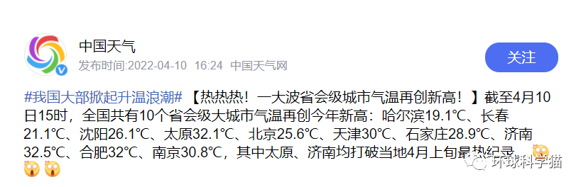 例如:一大波省会级城市气温都是再创新高,根据中国天气发布的数据显示, 截至 4月10日15时,全国共有10个省会级大城市气温再创今年新高,其中哈尔滨19.1℃、长春21.1℃、沈阳26.1℃、太原32.1℃、北京25.6℃、天津30℃、石家庄28.9℃、济南32.5℃、合肥32℃、南京30.8℃。而且太原、济南均打破当地4月上旬最热纪录,所以,相当地热。